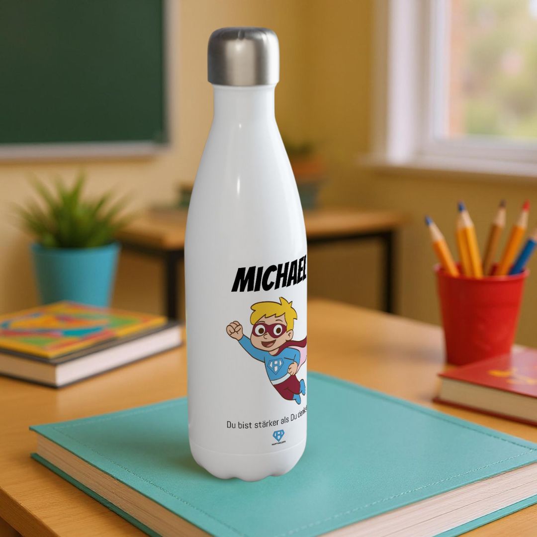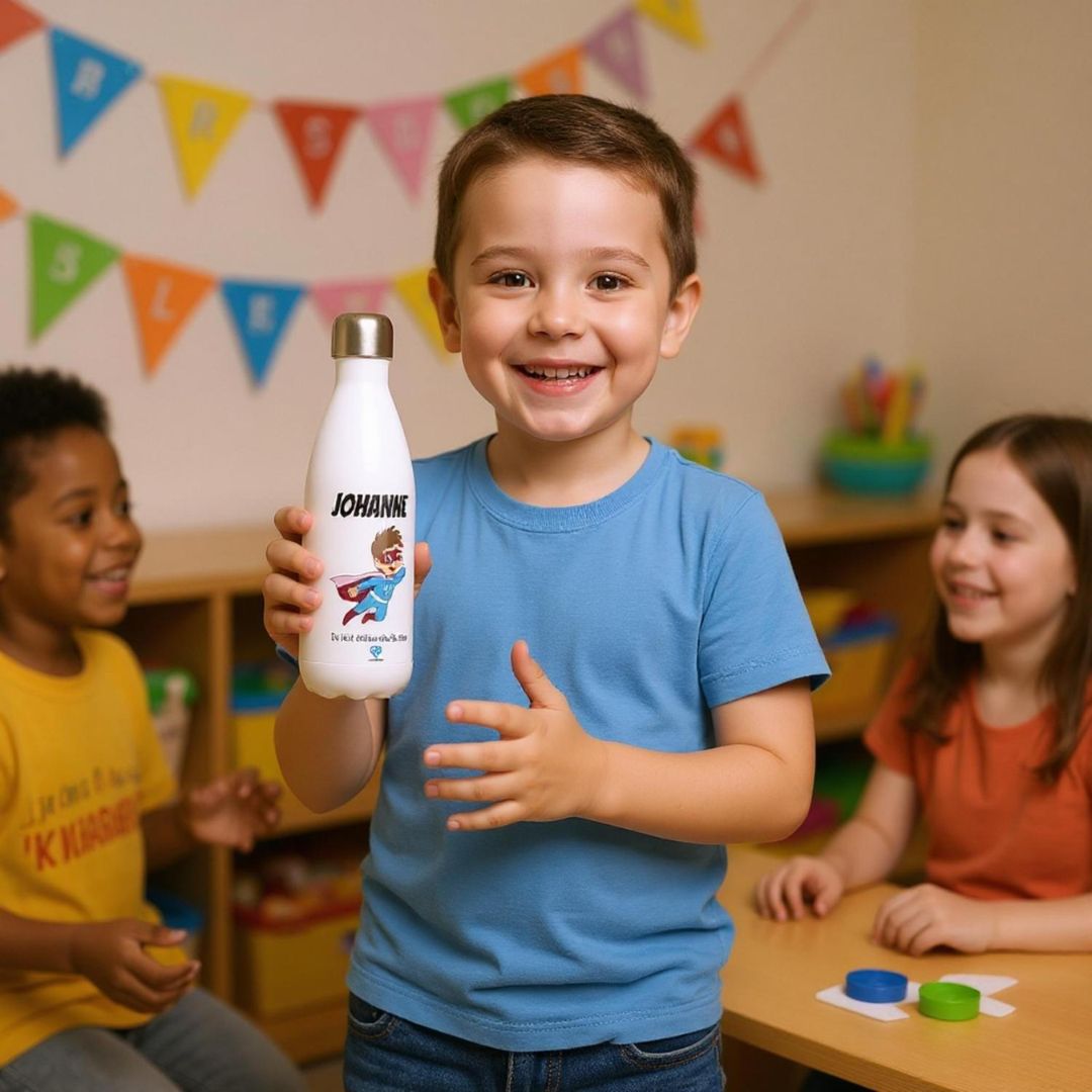 Ob für den Kindergarten, den Schulranzen oder unterwegs – diese hochwertige Edelstahl-Trinkflasche mit Happyhelden-Design ist nicht nur ein echter Hingucker, sondern auch funktional top. Mit dem Namen deines Kindes wird sie zum ganz persönlichen Lieblingsstück!