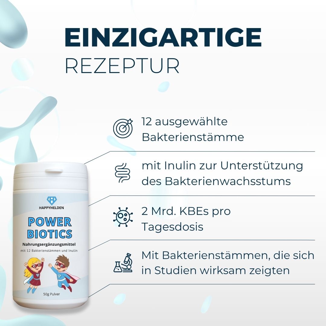 Die zwölf Stämme im Power Biotics wurden strategisch ausgewählt, basierend auf Forschungsergebnissen, die ihre Überlebensfähigkeit und Ansiedlung im Darmtrakt unterstützen. Power Biotics liegt in Pulverform vor, um eine einfache Verabreichung an Kinder zu ermöglichen.